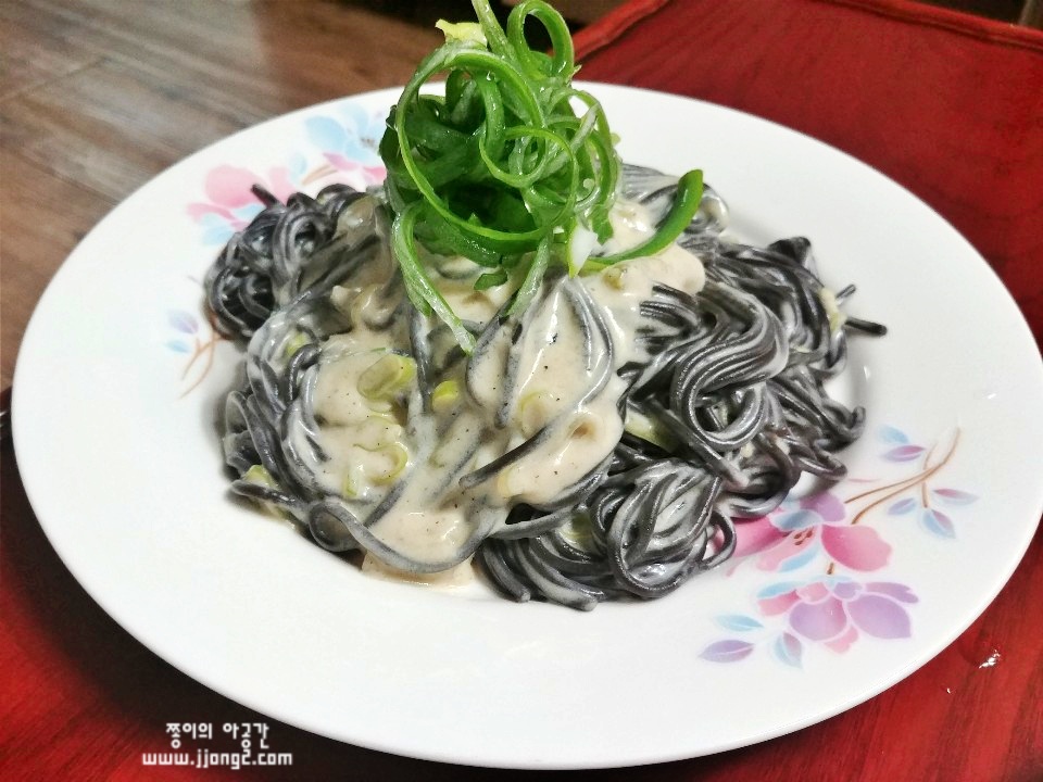 오징어 먹물 스파게티 면을 사용했어요. 음.. 소스만으로는 느끼할수 있어서 먹물 스파게티면은 일반 면보다는 간이 들어갔다고 해야될까요? 크림소스 계열 파스타에 잘 어울려요.