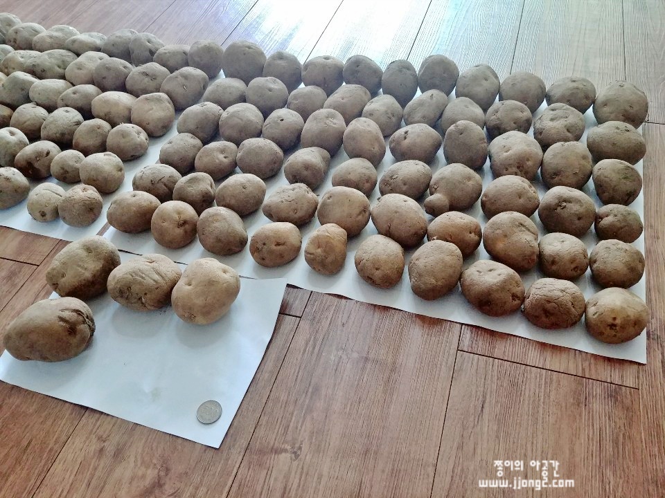 31일 날 배송받은 감자를 저장감자인걸 감안해서 물렁한 것과 단단한 걸 솎아내기 위해서 펼쳐보았어요. 종이에 놓인 동전은 500원이에요. 크기가 가늠되시나요!? 단단한 감자 1박스, 물렁한 감자 1박스 나눠서 물렁한 감자 먼저 얼릉 먹기 위해 구별했어요.