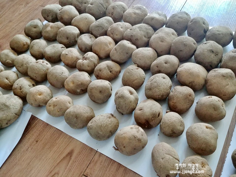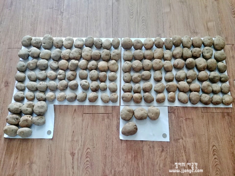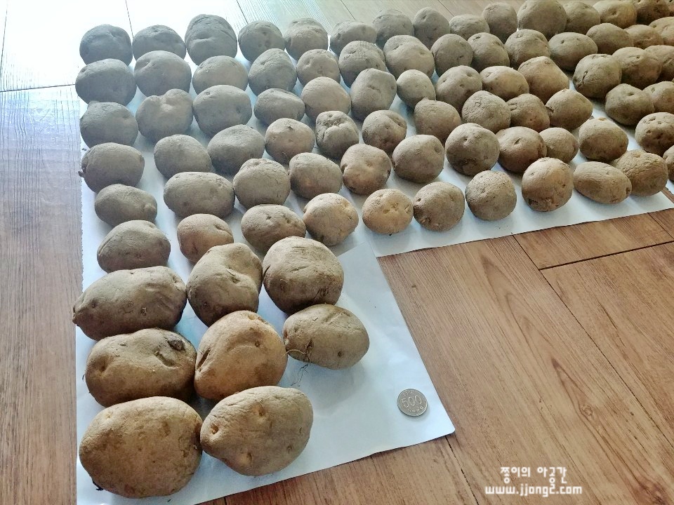 31일 날 배송받은 감자를 저장감자인걸 감안해서 물렁한 것과 단단한 걸 솎아내기 위해서 펼쳐보았어요. 종이에 놓인 동전은 500원이에요. 크기가 가늠되시나요!? 단단한 감자 1박스, 물렁한 감자 1박스 나눠서 물렁한 감자 먼저 얼릉 먹기 위해 구별했어요.
