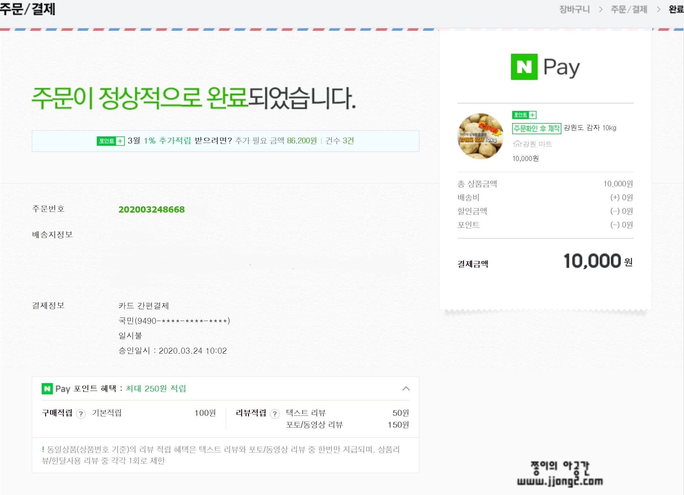 강원도 전체에 약 11,000톤에 해당하는 감자 재고가 남아있어서 처리하기 곤란하다는 상황이었는데요. 감자 10kg를 5천 원에 판매! 그것도 무료배송으로요. 이게 SNS에 소문이 퍼지고 네이버 블로그 등등에 소문나자 오전 10시에 열리는데 사람들이 몰려서 못사겠더라구요. 저도 한 번씩 생각날 때 도전하다가 마지막 날 성공해서 10kg x 2 10,000원에 구매 성공했습니다. 3월 24일 날이 마지막 판매 날이었고, 그 날 성공해서 3월 31일 날 받았어요.