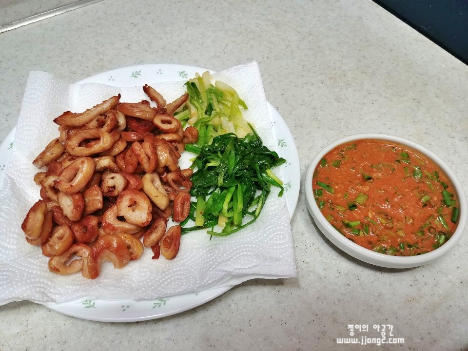 아무생각없이 막창 1kg 후라이팬에 한번에 굽기 시작했는데 기름이.... 엄청 나오더라구요. 쪽파도 같이 구워줬어요. 한 30분은 젓가락으로 휘적휘적 저은거 같아요. 1kg 양이 마지막에 저렇게 줄어들어서 '너무 바짝 구웠나?' 싶었는데 뒷탈 안날려면 이렇게 구워야겠죵?? 어머니랑 막창에 상추쌈으로 맛있게 먹었습니다. 만족만족! 다음에 혹시 또 막창을 먹게된다면 에어프라이기에 한번 구워보고 싶네요. 30분동안 젓가락을 뒤적였더니... ㅠ ㅎㅎ