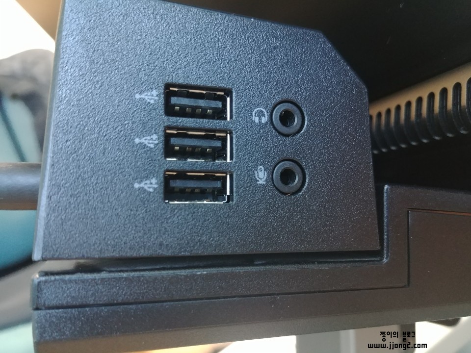 뒤쪽 USB 포트 보시면 2 군대 파란색인 게 보이실 거예요. 파란색이어야 USB 3.0입니다.